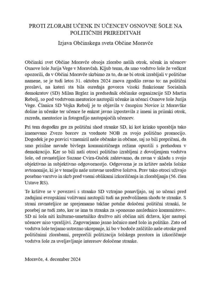 Županova izjava o “zlorabi učencev” na političnih dogodkih je težka obtožba, a tudi ta bi morala temeljiti na konkretnih dejstvih in ne na osebnih interpretacijah dogodkov. Če gre za spor o nastopih učencev na prireditvah, povezanih z Zvezo borcev, bi morda kazalo najprej preveriti širši kontekst teh dogodkov. Ali so bile vključene vse strani? Ali so starši teh otrok imeli možnost izraziti mnenje? Ali gre res za politično prireditev ali zgolj za zgodovinsko obeležje, ki presega strankarske interese?